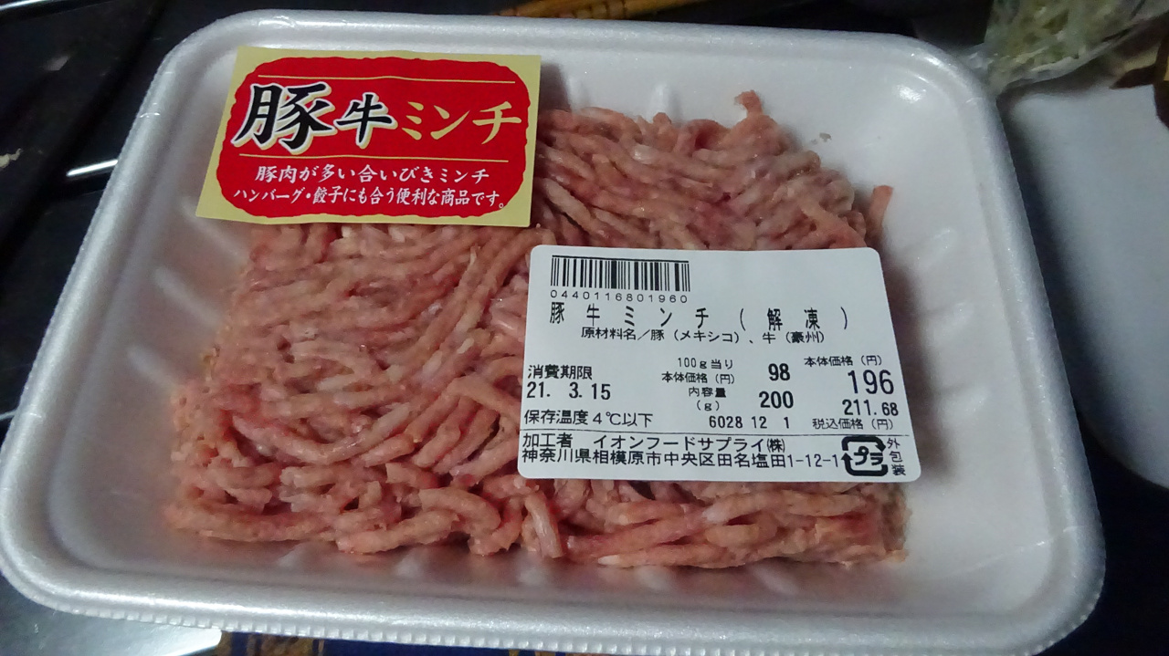 地元のイオンで買った豚牛ミンチ。