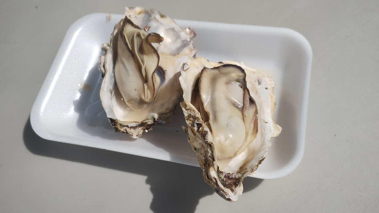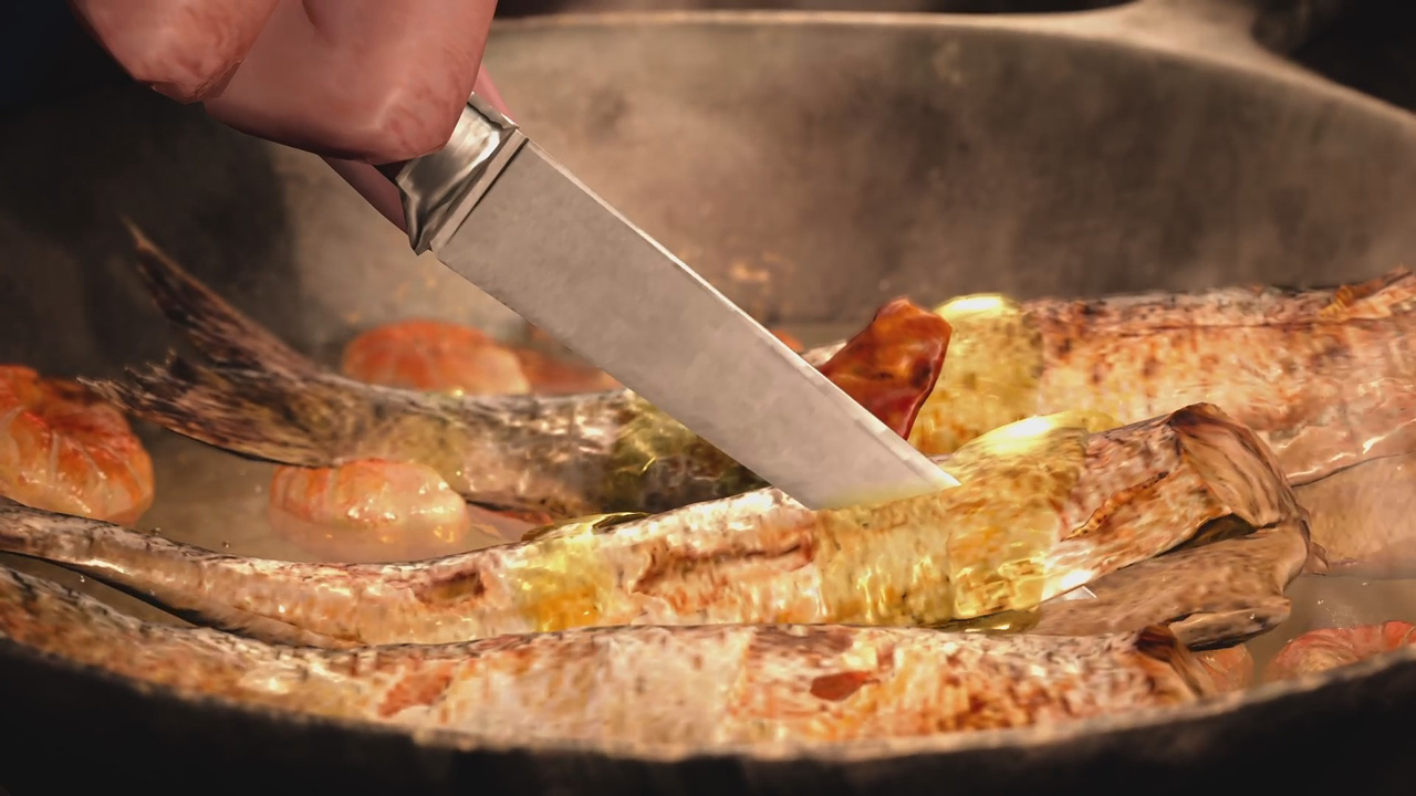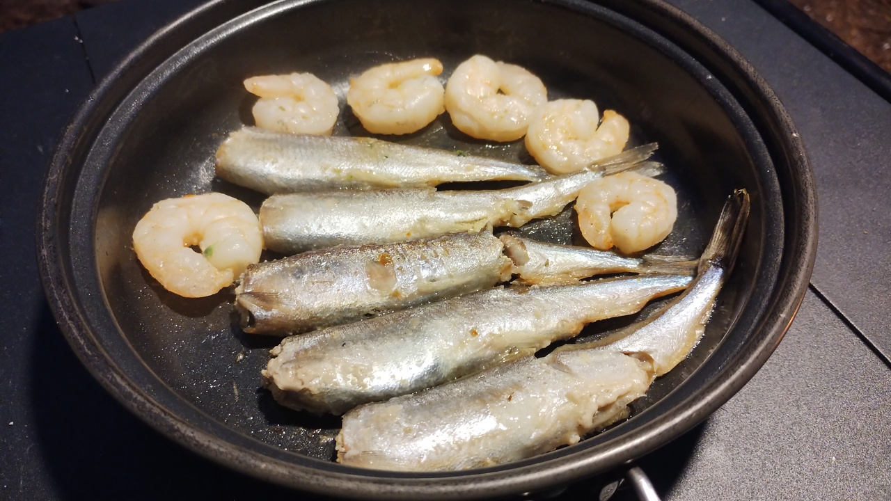 魚をエビと一緒に焼いて、オイルをかけていただきます。