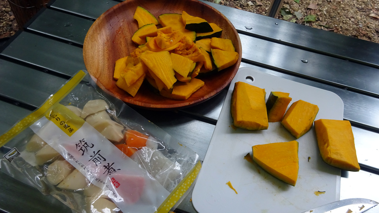 まずは出汁を入れた水を茹でて、カボチャと筑前煮の汁を捨てた具だけを投入。