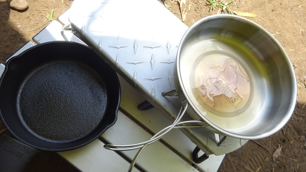 雑誌の付録のCHUMSのクッカーと、16cmのキャプテンスタッグのスキレット。