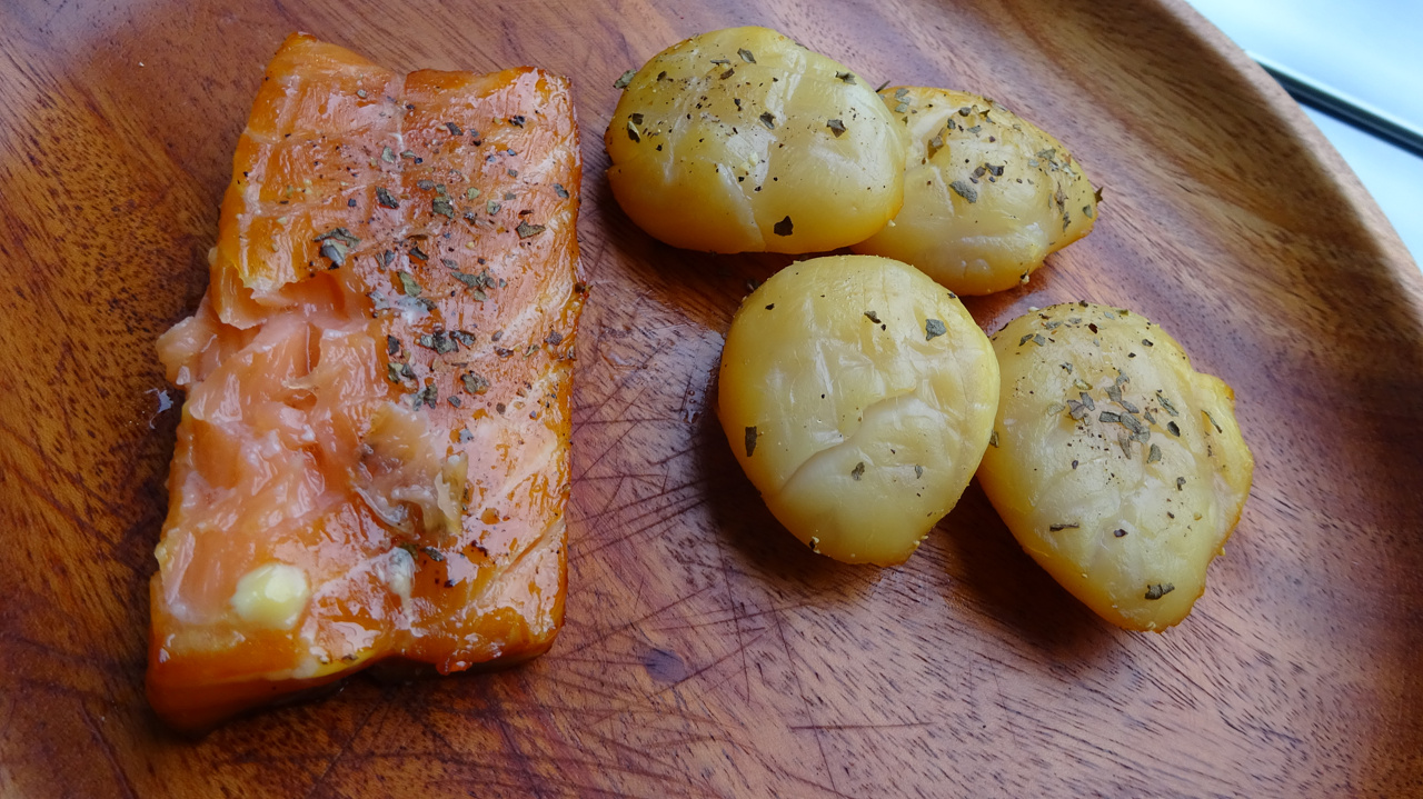 シャケとホタテは塩胡椒とバジルで味付けしてあります。