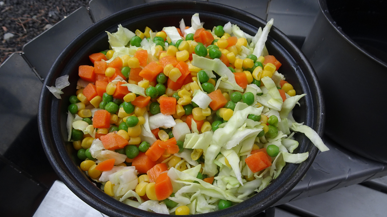 まずは玉ねぎとキャベツをザクザク切り、ミックスベジタブルと一緒に炒めます。