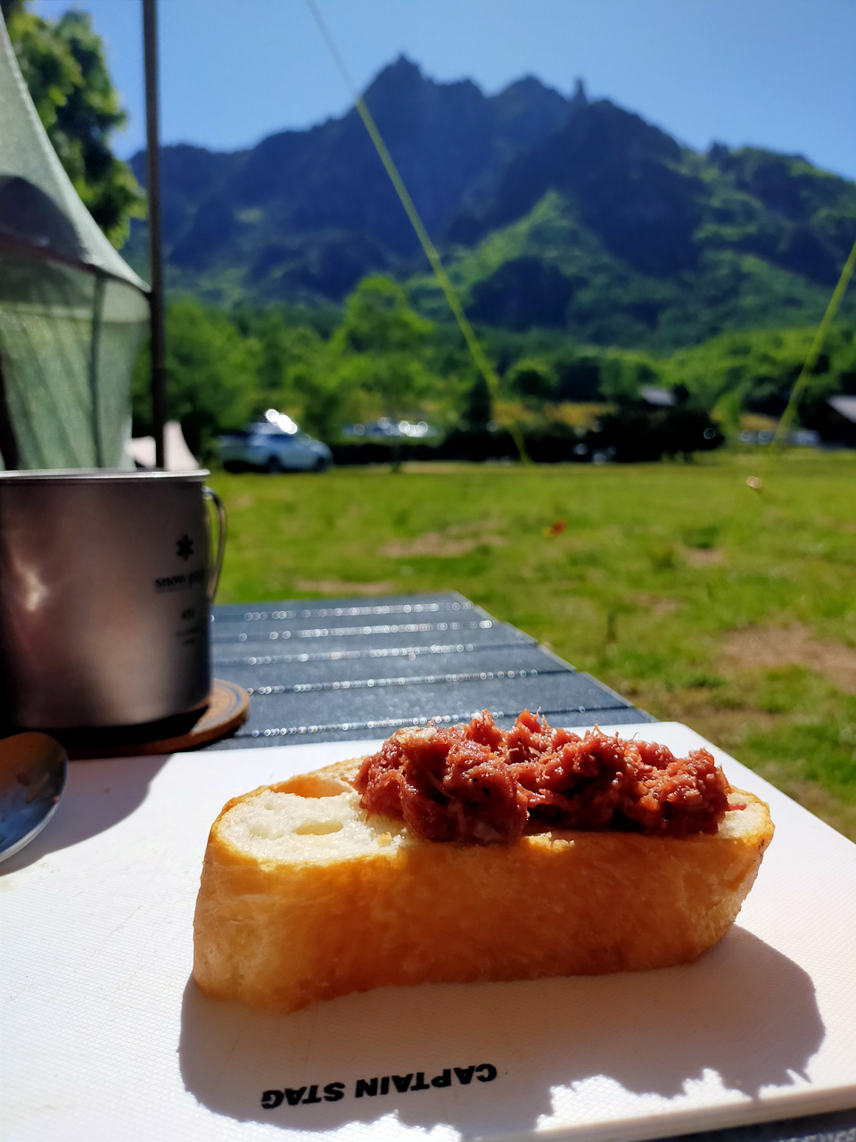 自然の中で瑞牆山を見ながらコーヒーとパンを食べる。