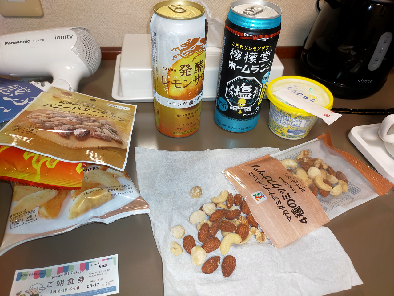 こんにゃくバイキングとかでいろいろ食べたので、ホテルではお菓子でおしまい。