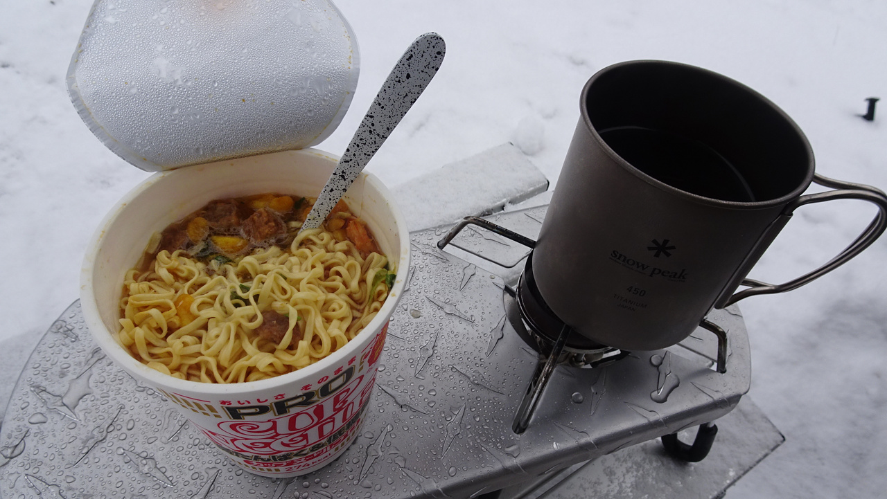 雪の中で食べるカップ麺、美味しい・・・
