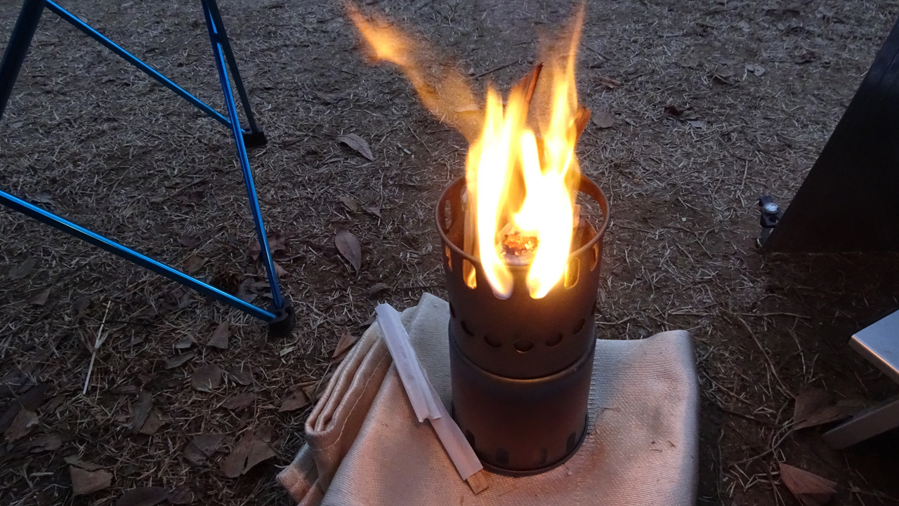 いったん風が完全にやんだので、とは言え大っぴらに焚き火すると片付けが大変なので、ソロストーブを使います。