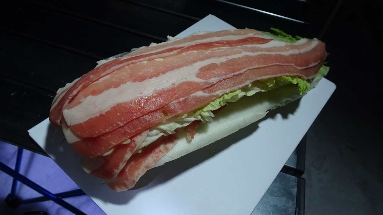 まず白菜、豚バラ、白菜、豚バラ、白菜と重ねて、これを5cm程度にカット。