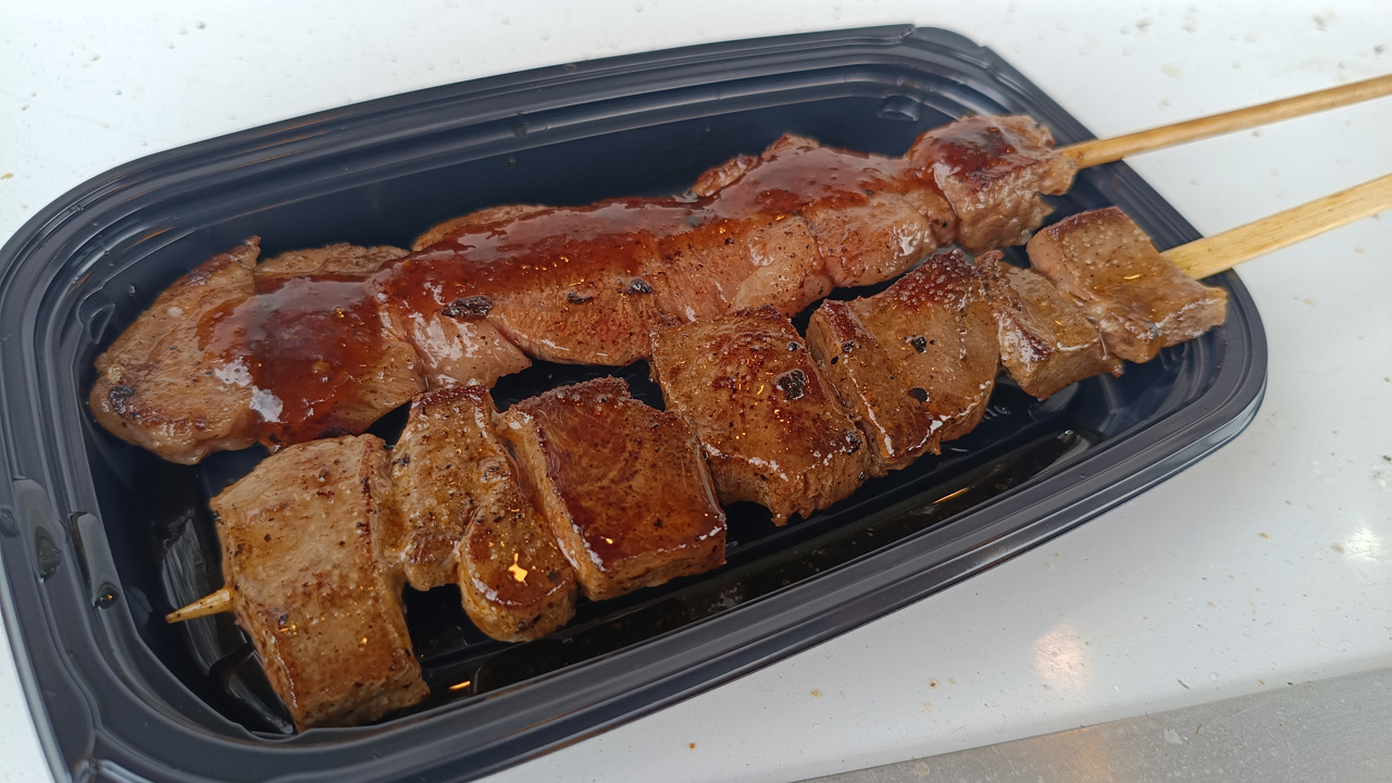 なにわ黒牛の霜降りステーキと、牛タン串。