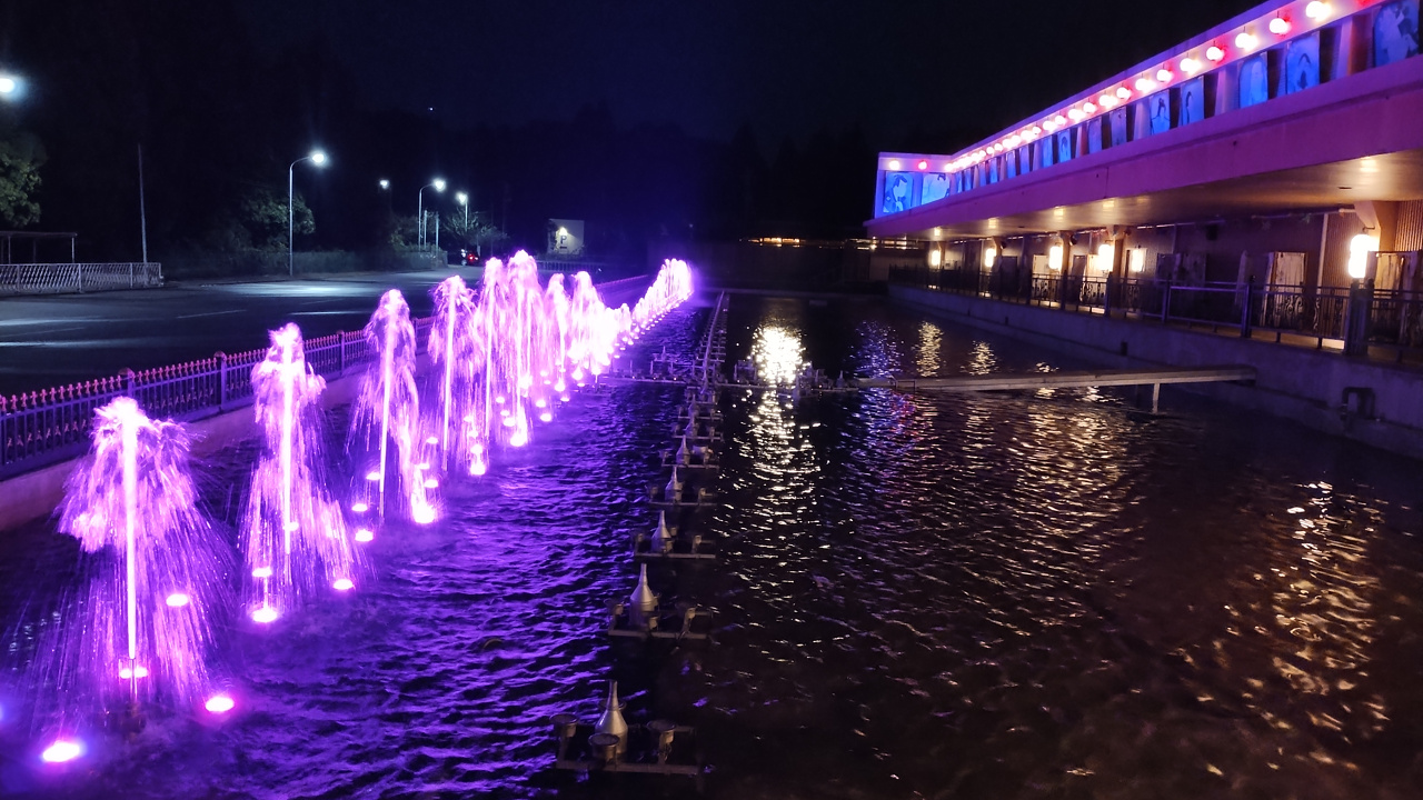 最初は鬼滅の刃のOPテーマに合わせた噴水。